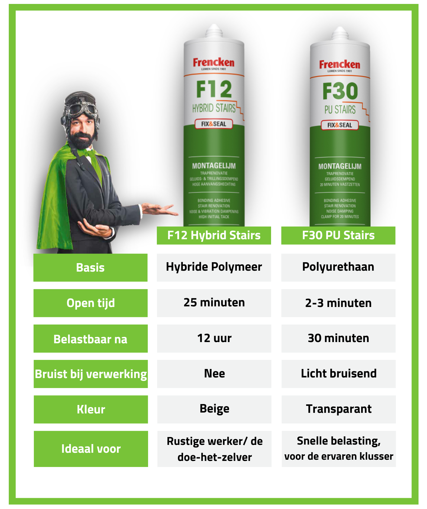 Als jij op zoek bent naar een sterke (SMP hybride polymeer) lijm voor traprenovaties ben je hier aan het goede adres. De F12 Hybrid Stairs van Frencken is erg gebruiksvriendelijk, elastisch én geluiddempend. Onder andere deze kenmerken maken de F12 Hybrid Stairs een erg goede traprenovatielijm.