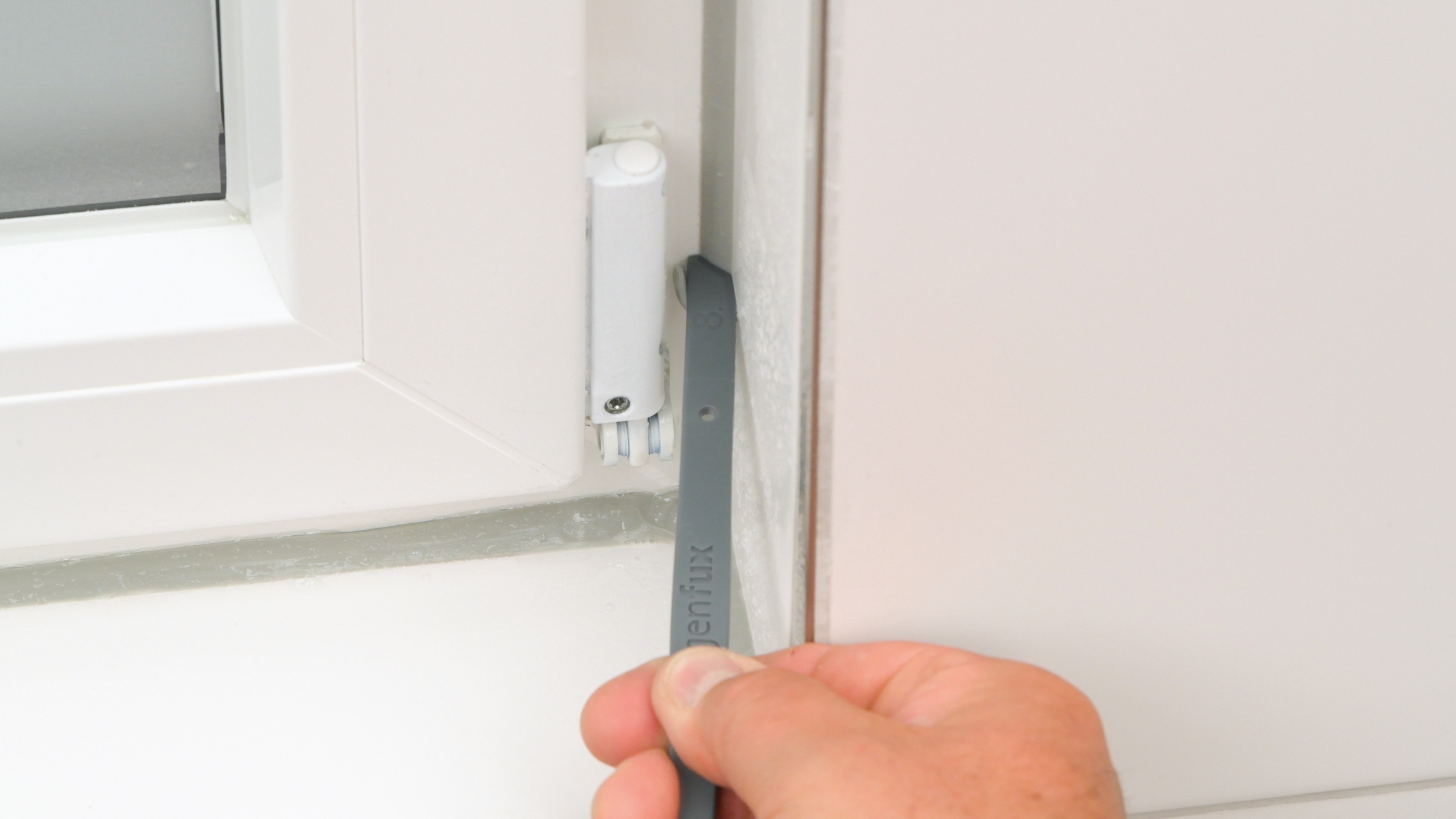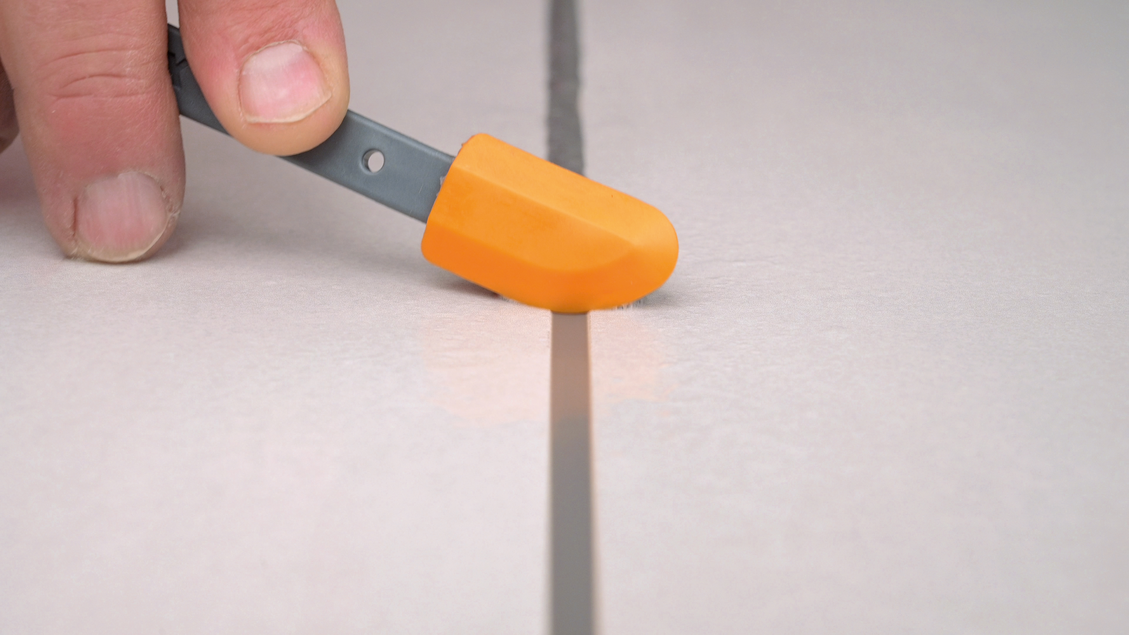 Van tevoren is het van belang om de Fugenfux Multitool te bevochtigen in een schone bak met de afwerkzeep. Hierna is het mogelijk om de Fugenfux Multitool met gelijkmatige druk over de gevulde voeg te trekken. De overtollige afdichtkit kan in de afvalbak verwijdert worden.