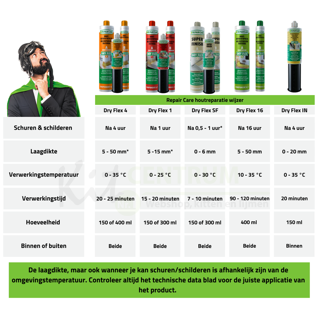 Bekijk hier het datablad met alle informatie over de Dry Flex 16 van Repair CareRepair Care Dry Flex 16 400ml - Houtreparatie: Houtrotvuller - Kitcentrum.be