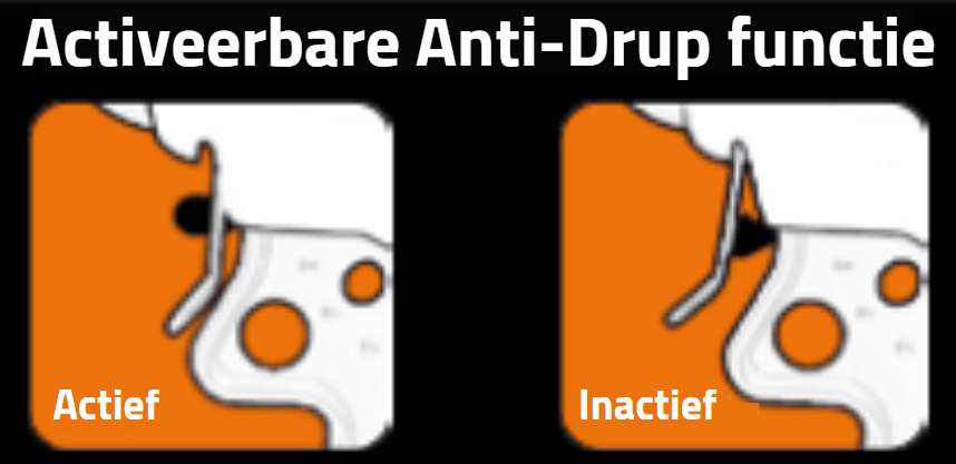 Om de anti-drip functie te activeren moet je vóórdat je gaat kitten de hieronder afgebeelde drukplaat indrukken én het clipje naar boven schuiven. Enkel de drukplaat indrukken is niet voldoende.