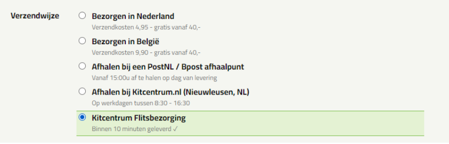 Om gebruik te maken van de flitsbezorging kan je het reguliere bestelproces volgen en afrekenen volgens de betaalmethodes die je van ons gewent bent. Bij het aanvinken van de verzendwijze staat hier nu ook de optie 'Kitcentrum Flitsbezorging' tussen. Klik deze aan en de bestelling wordt binnen 10 minuten geleverd. Staat deze optie er bij jou nog niet tussen? Lees dan de FAQ's hieronder.