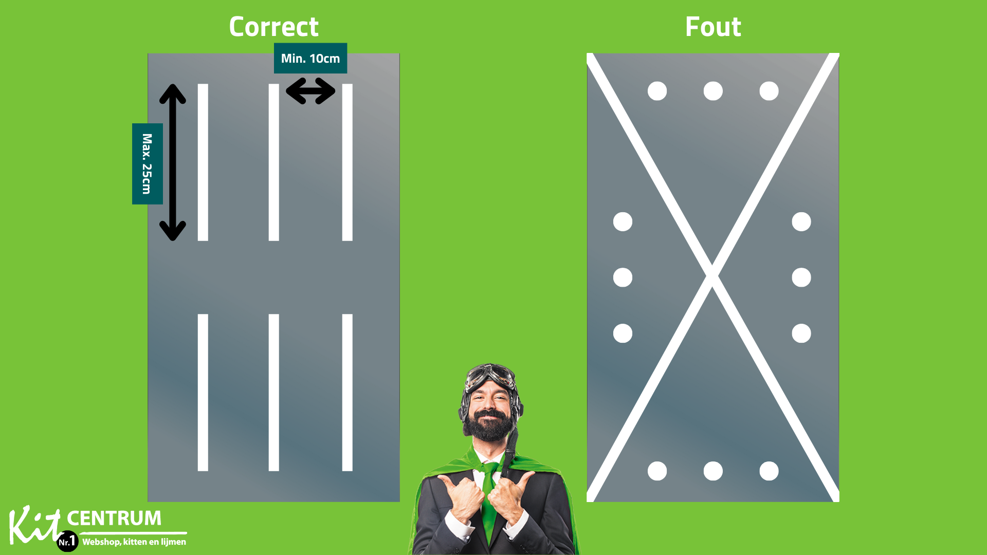 Een hightack (die we in dit stappenplan gebruiken als onze spiegellijm) breng je altijd in verticale rillen aan. Voorkom dat je de hightack aanbrengt in dotten of horizontale/schuine rillen. Hierdoor kan vlekvorming of een uithardingsvertraging ontstaan.