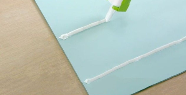 Met de Kitcentrum High Tack Kit hoef je je nergens zorgen om te maken wanneer jij je spiegel wilt verlijmen. Het enige belangrijke is dat je de lijm correct aanbrengt. Dit doe je in rechte rillen, zoals hieronder te zien is. Hoe je dit perfect doet, leggen we onder de foto verder voor je uit.