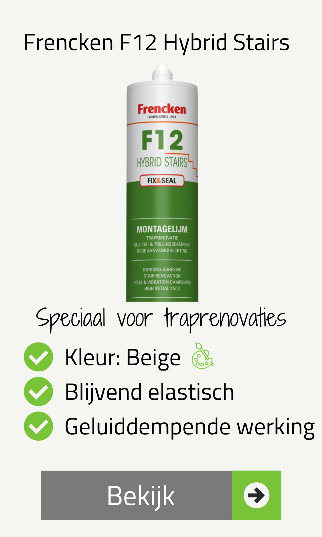 Voor het uitvoeren van traprenovaties worden vaak veel verschillende producten gebruikt. Dit werkt soms prima, maar er is een lijm die speciaal ontwikkeld is voor traprenovaties! Dit is de Frencken F12 Hybrid Stairs. Deze lijm is erg geschikt om overzet tredes en stootborden snel én goed te verlijmen. Het is een erg elastische en geluiddempende lijm, wat er voor zorgt dat beweging goed kan worden opgevangen en dus niet zal kraken. Het naklemmen van de tredes of stootborden is bij deze traprenovatielijm niet nodig!