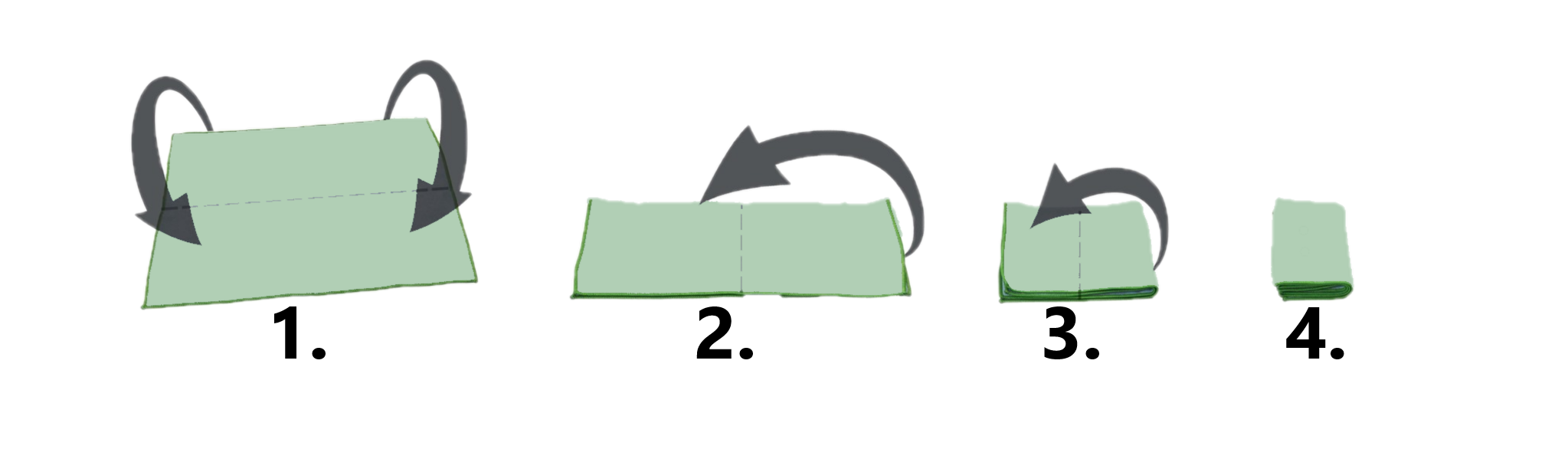 • Door een doek in vieren te vouwen (of zelfs verder) heb je 8 of 16 schone kanten. Wanneer een kant vervuild is neem je een schone kant. Wanneer alle kanten vervuild zijn, pak je een van de schone microvezeldoekjes. Door de doeken niet meer te spoelen in een emmer water, blijven de bacteriën in het doek en worden zij niet verplaatst naar het water in de emmer of vervolgens via de doek verplaatst naar een ander te reinigen onderdeel.Microvezeldoek_vouwen_kitcentrum