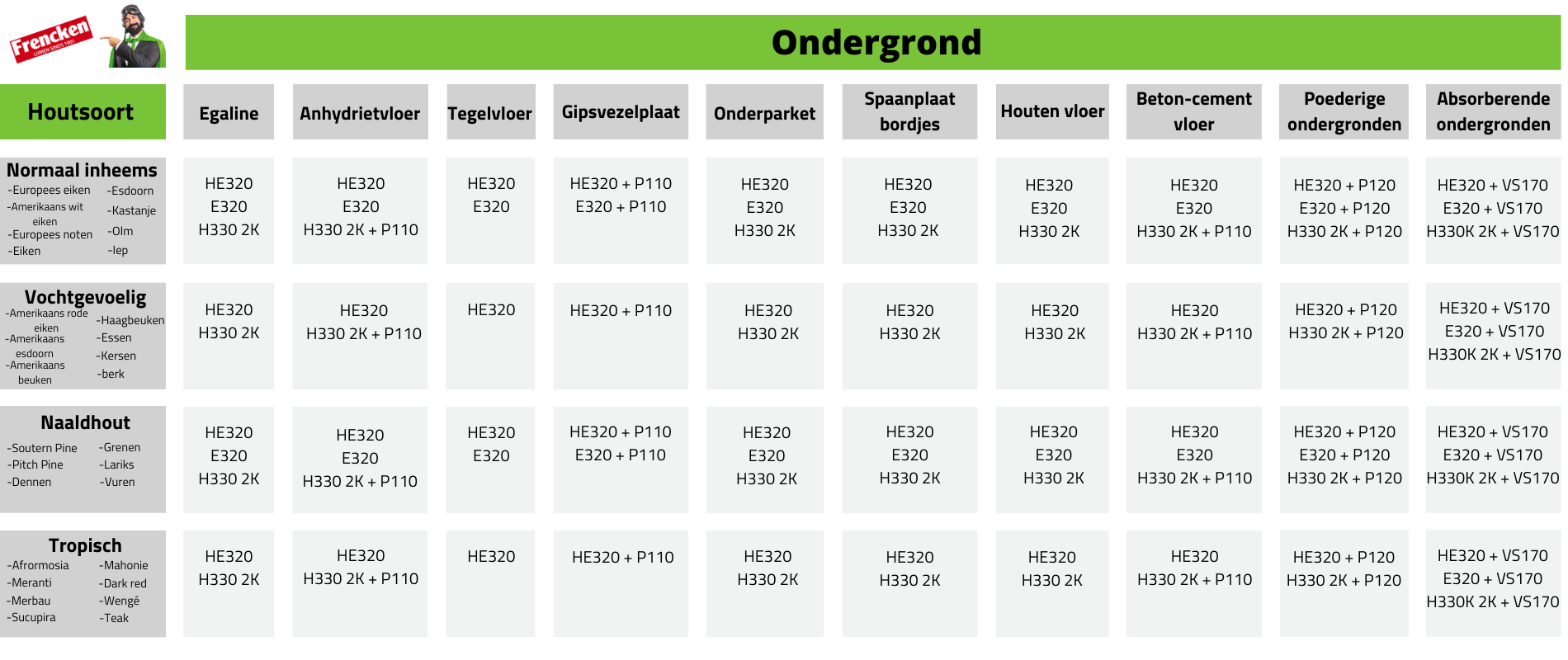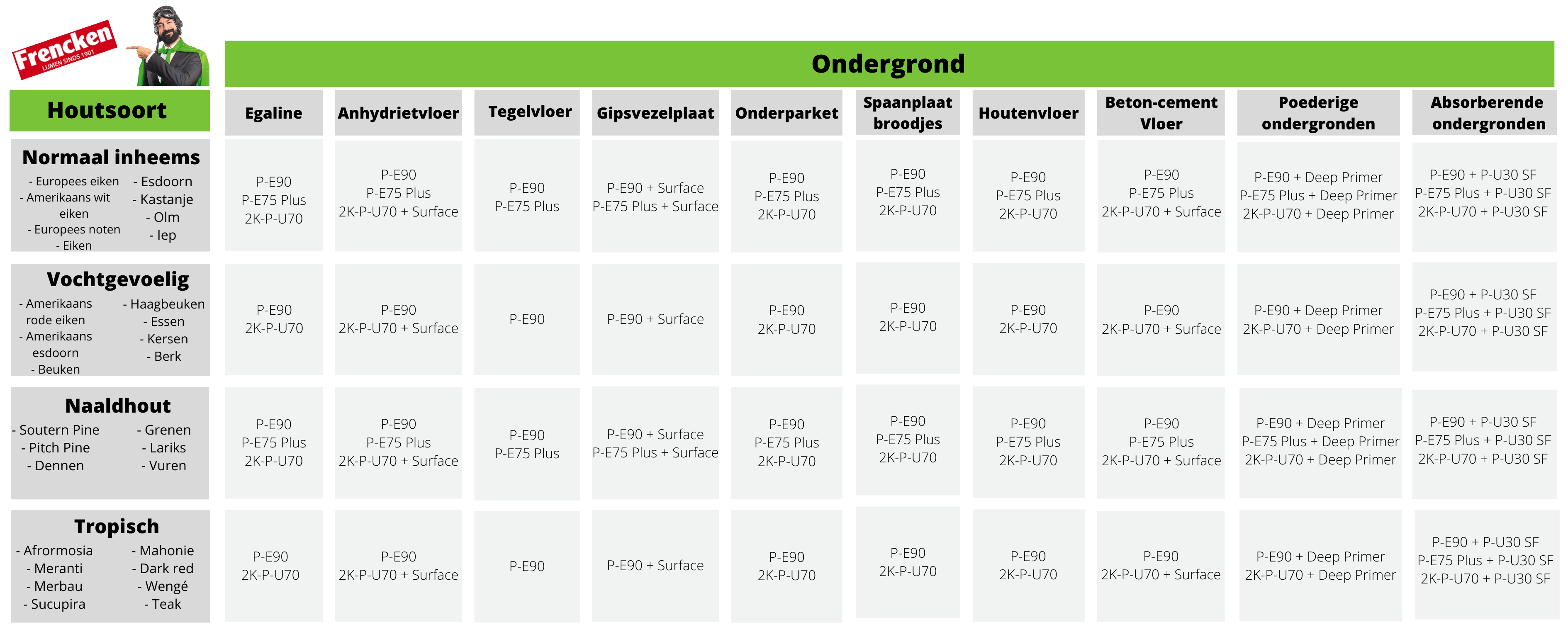 Dit is geheel afhankelijk van de houtsoort die je wilt verlijmen en de ondergrond waarop je het wilt verlijmen. In de onderstaande tabel vind je de meest voorkomende houtsoorten en ondergronden en welke parketlijm Frencken adviseert. We gaan kijken aar verschillende ondergronden en maken vervolgens onderscheid in: