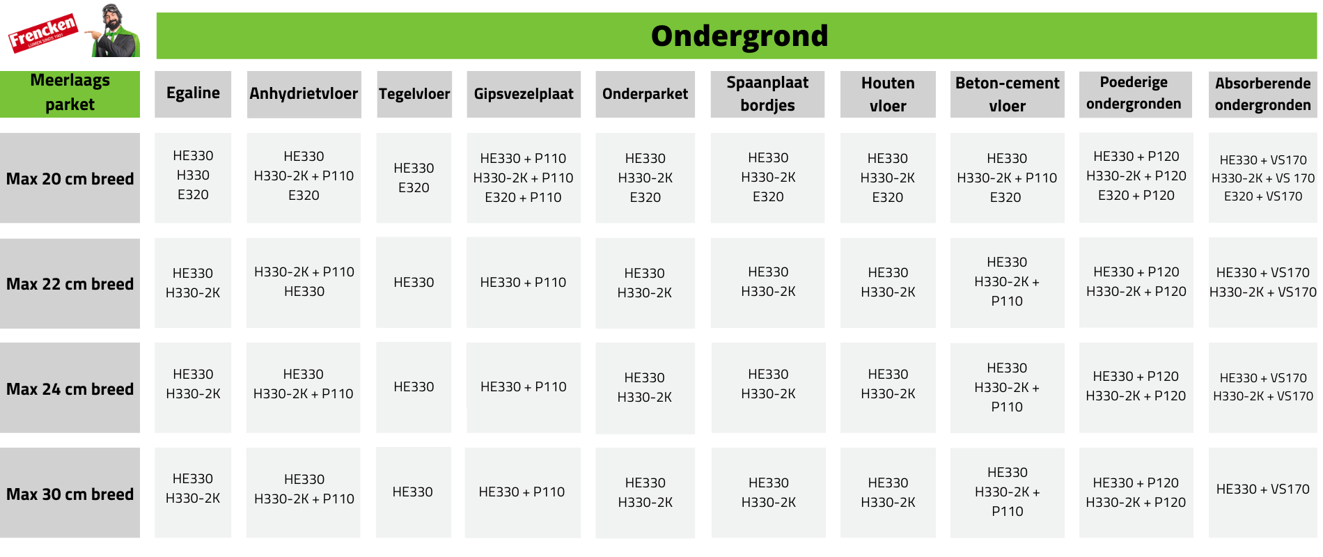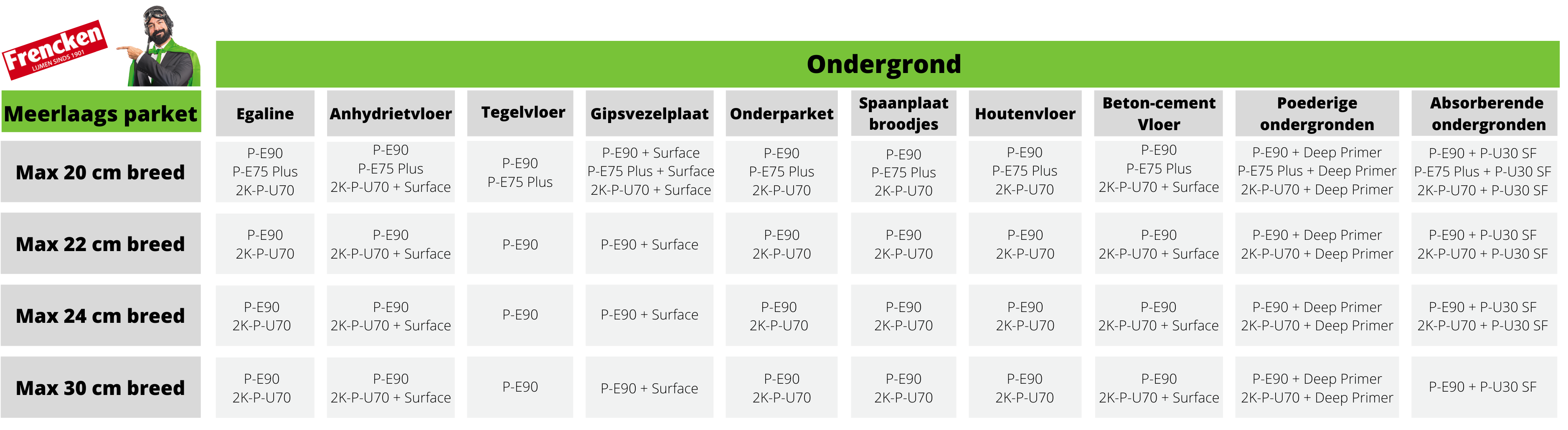 Zoals verteld zie je dat er meerdere lijmen in één blokje kunnen staan. Maar dit betekent niet dat ze allemaal geschikt zijn. Frencken maakt namelijk onderscheid in de breedte van de planken. Afhankelijk van de breedte kan een andere lijmsoort nodig zijn bij massieve planken. Bij de volgende maten wordt de volgende lijmen geadviseerd