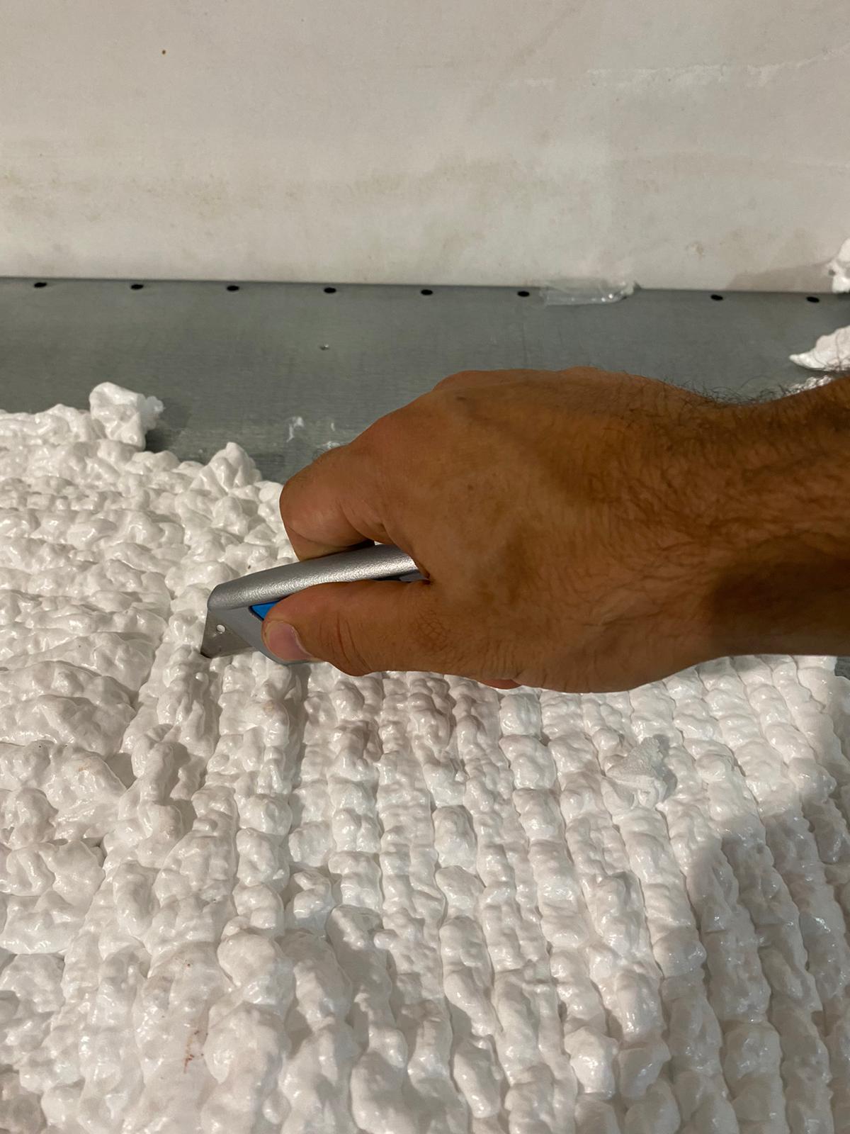 De eerste stap is zoveel mogelijk van het purschuim mechanisch verwijderen. Dit kan met behulp van bijvoobeeld een olfames. Als het een beetje loslaat kan je proberen het met je handen los te trekken. Blijf rustig snijden als dit niet lukt.