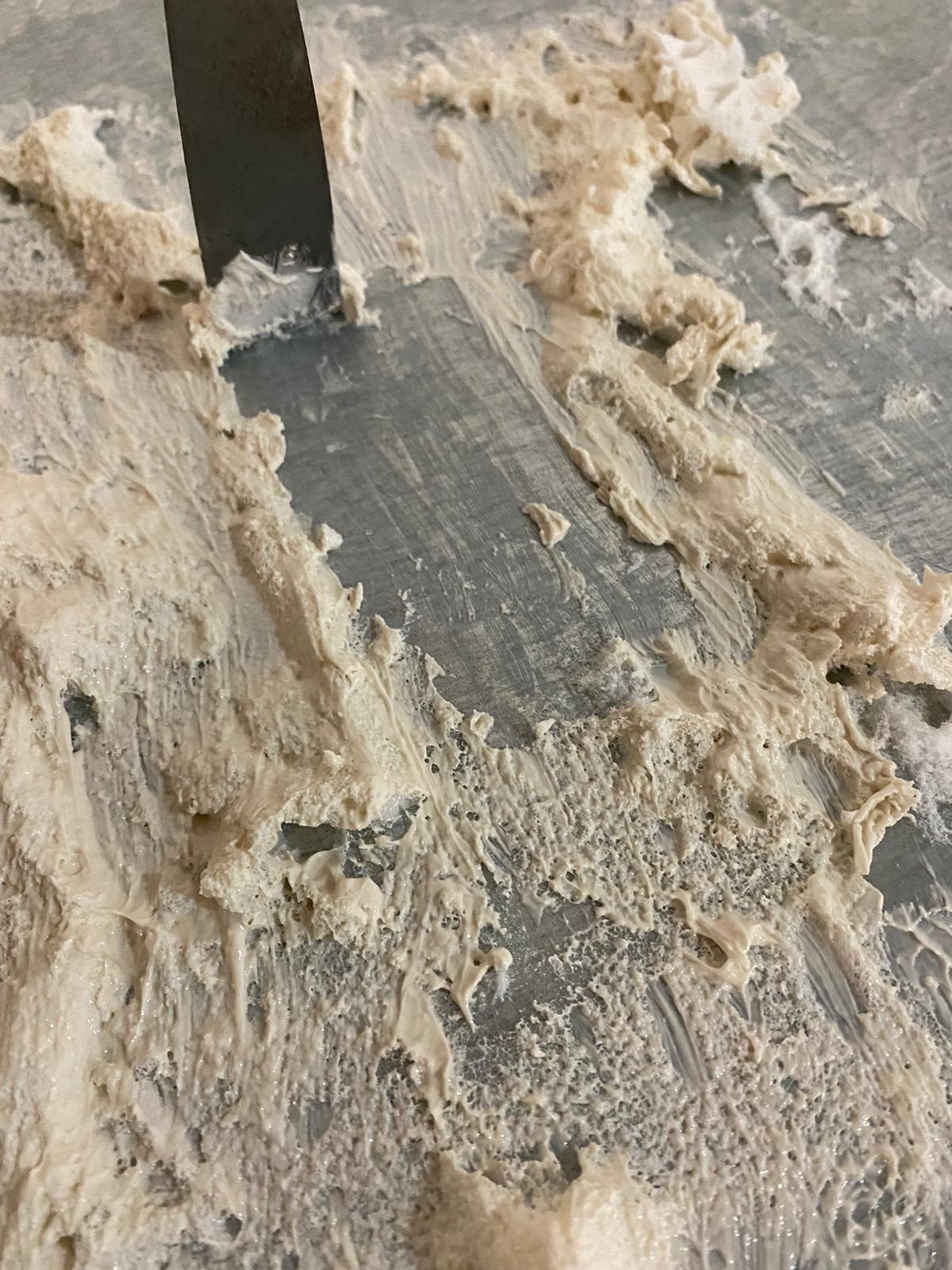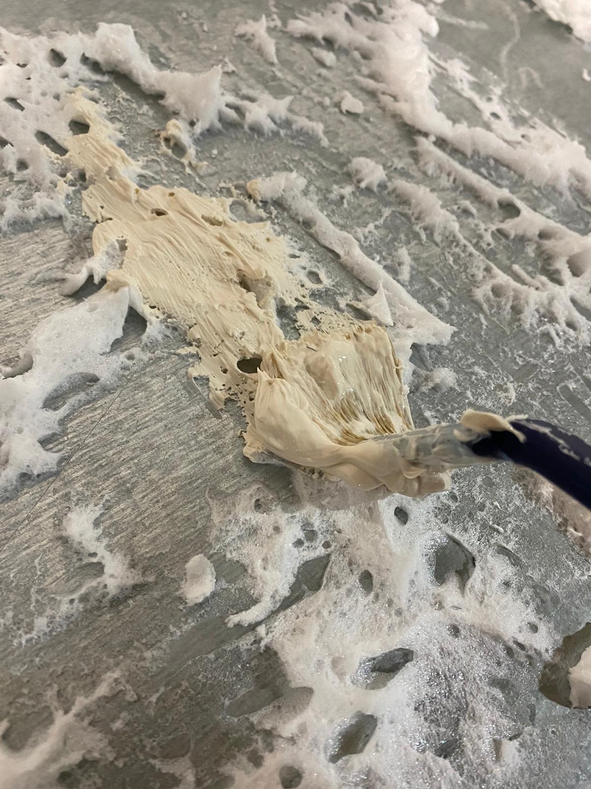 Als de tijd verstreken is, heeft de purschuim verwijderaar de restanten purschuim zacht gemaakt. Je kan dus vervolgens de purschuim rustig verwijderen. Wij hebben dit gedaan met behulp van een plamuurmes. Zorg ervoor dat je dit voorzichtig doet en de ondergrond niet beschadigd. Je zult merken dat sommige delen wat makkelijker los laten dan andere. Probeer het zoveel mogelijk weg te halen. In de 2e foto hieronder zie je dat het ons niet is gelukt om de resten in 1x weg te halen. We hebben de purschuim verwijderaar hierom nog een keer aangebracht zoals je ziet in de 3e foto hieronder. Laat het wederom rustig in trekken en probeer het opnieuw te verwijderen. Herhaal dit proces tot vrijwel alle purschuim verwijdert is.