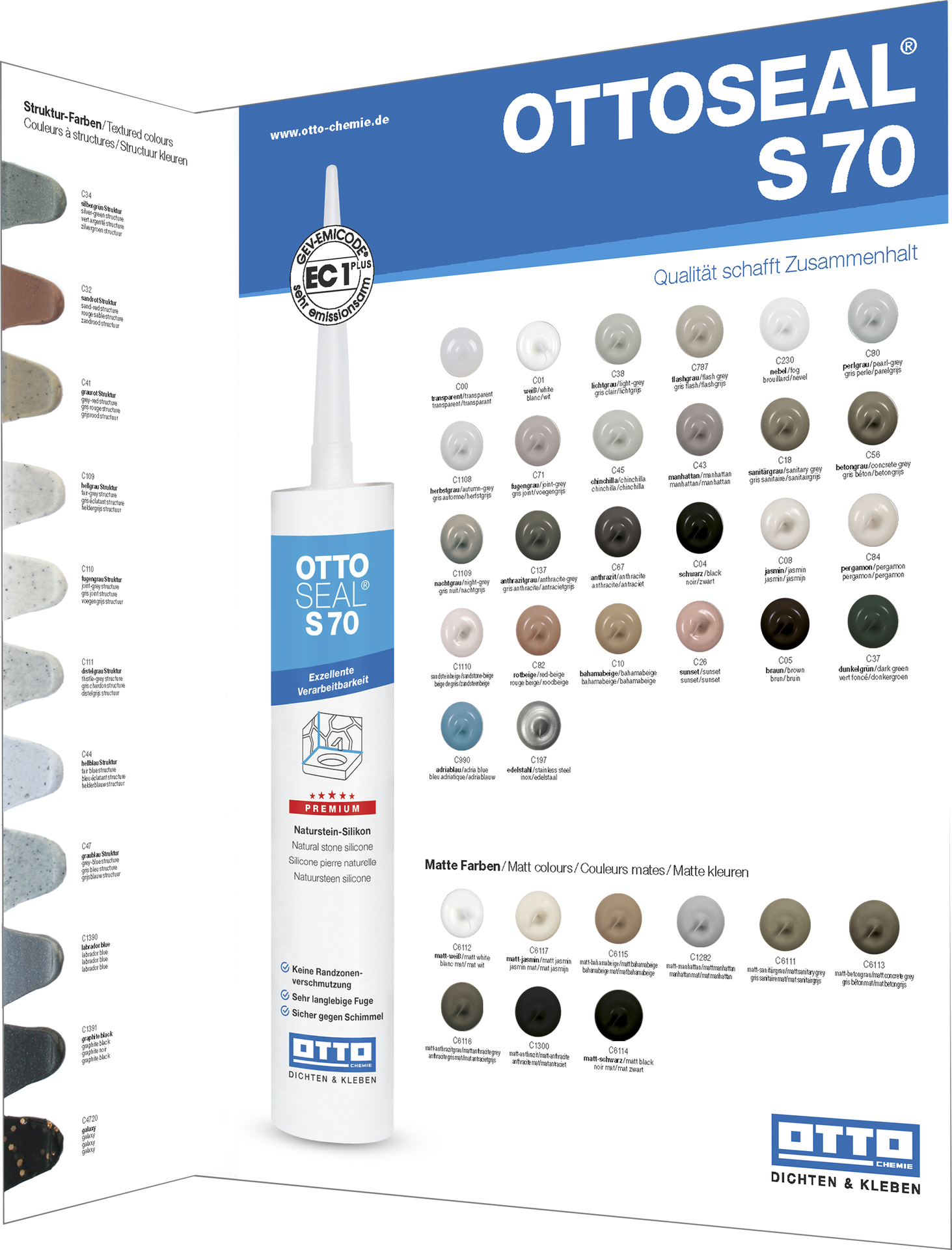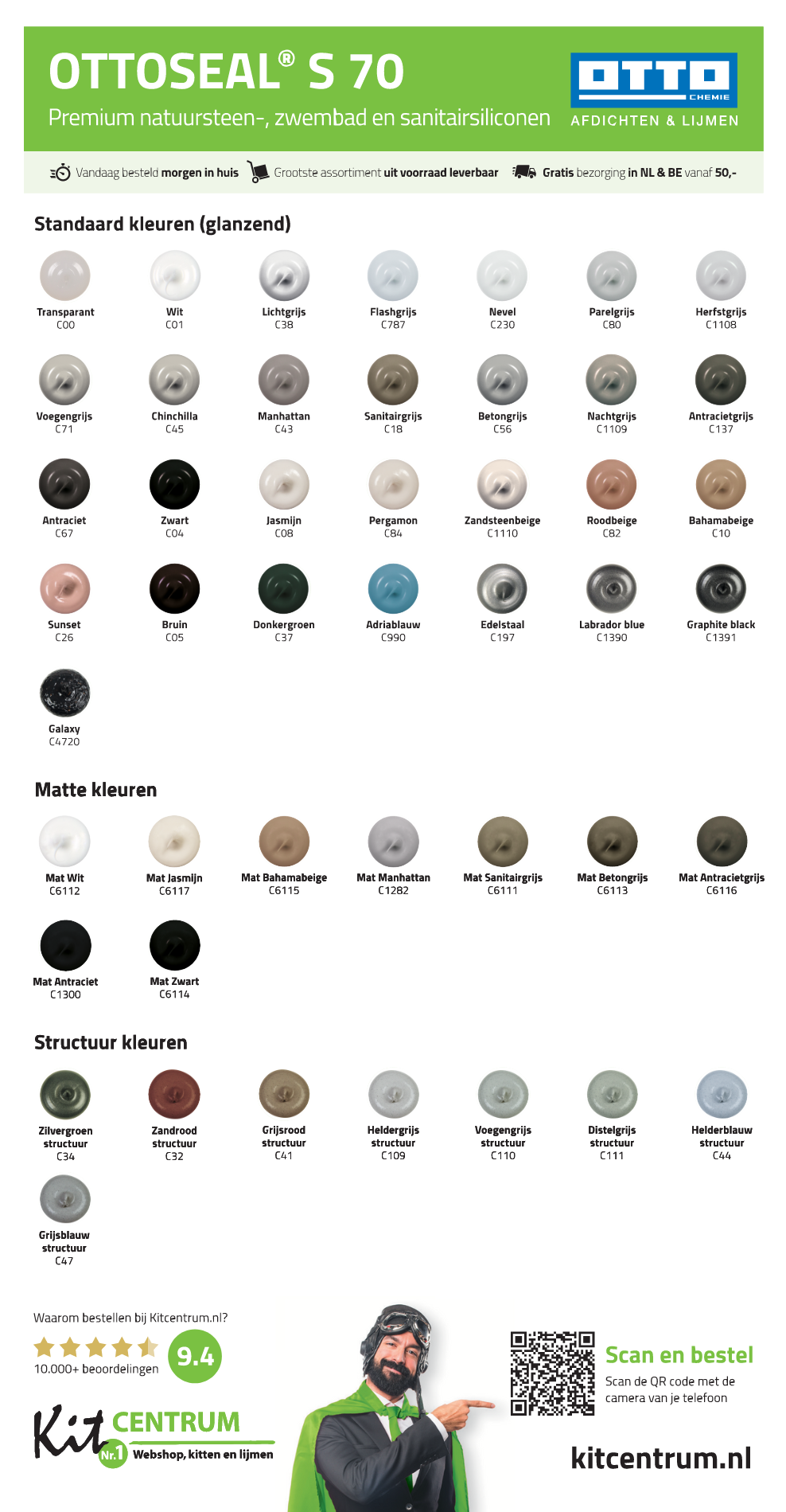 Zoek je een professionele natuursteen siliconenkit? Dan is de Ottoseal S70 van het duitse merk Otto Chemie het meest aangewezen product. Deze premium natuursteen siliconenkit van Otto Chemie is verkrijgbaar in meer dan 40 kleuren. Deze afdichtingskit is zeer goed te gebruiken bij alle sanitaire toepassingen in combinatie met veel verschillende soorten natuursteen. Deze siliconenkit is extra uniek door de aanwezigheid van matte kleuren en structuur varianten.  Ottoseal S70 | Premium natuursteenkit | Kitcentrum.be