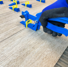 Als je alle wiggen geplaatst hebt, kun je deze met behulp van de speciale tang strak drukken. Dit mag mest best veel kracht en je zult direct zien hoe de tegels op gelijke hoogte komen. Op de foto hieronder zie je hoe je de tang vast moet houden!