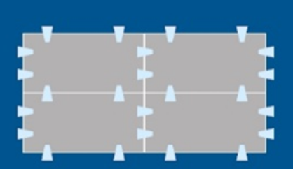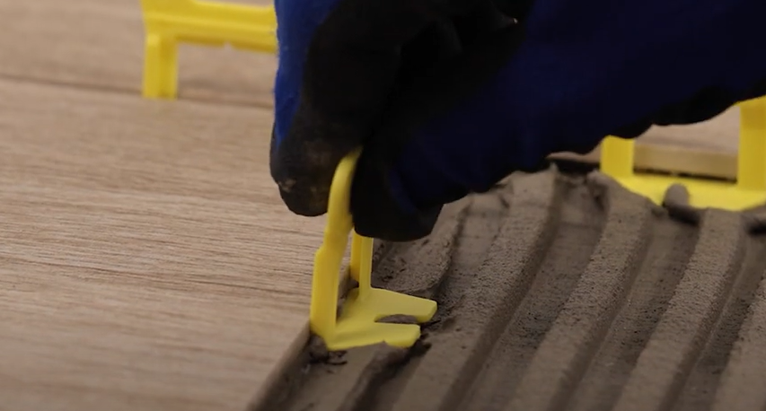 Wanneer je de tegellijm hebt aangebracht kun je beginnen met het plaatsen van de eerste tegel. Vervolgens schuif je direct clips tussen de tegel en de tegellijm. Doe dat zo veel mogelijk met het onderstaande patroon.