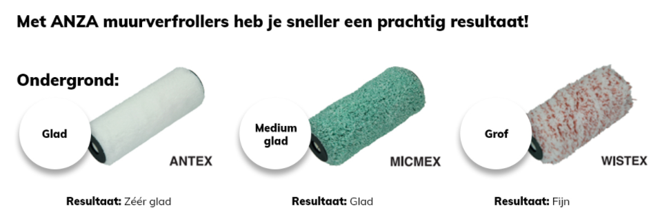 Voor ieder te schilderen oppervlak heeft ANZA wel een verfroller. De witte ANZA rollen zijn geschikt voor de gladde ondergronden. Deze hebben een korte poolhoogte en zijn te herkennen aan hun dichtheid. De groene ANZA rollen zijn ontwikkeld om muren en plafonds te schilderen die redelijk glad of een kleine structuur hebben. De poolhoogte van deze rollen zijn zo ontwikkeld om voldoende capacitieit te hebben maar niet teveel structuur aan te brengen. De roze ANZA roller is geschikt voor het schilderen op ruwe ondergronden. Deze rollen hebben een grote poolhoogte die er voor zorgt dat de verf goed in de poriën komt.