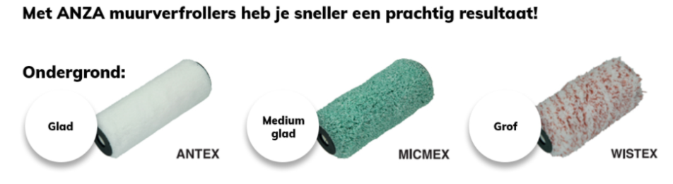 Voor ieder te schilderen oppervlak heeft ANZA wel een verfroller. De witte ANZA rollen zijn geschikt voor de gladde ondergronden. Deze hebben een korte poolhoogte en zijn te herkennen aan hun dichtheid. De groene ANZA rollen zijn ontwikkeld om muren en plafonds te schilderen die redelijk glad of een kleine structuur hebben. De poolhoogte van deze rollen zijn zo ontwikkeld om voldoende capacitieit te hebben maar niet teveel structuur aan te brengen. De roze ANZA roller is geschikt voor het schilderen op ruwe ondergronden. Deze rollen hebben een grote poolhoogte die er voor zorgt dat de verf goed in de poriën komt.